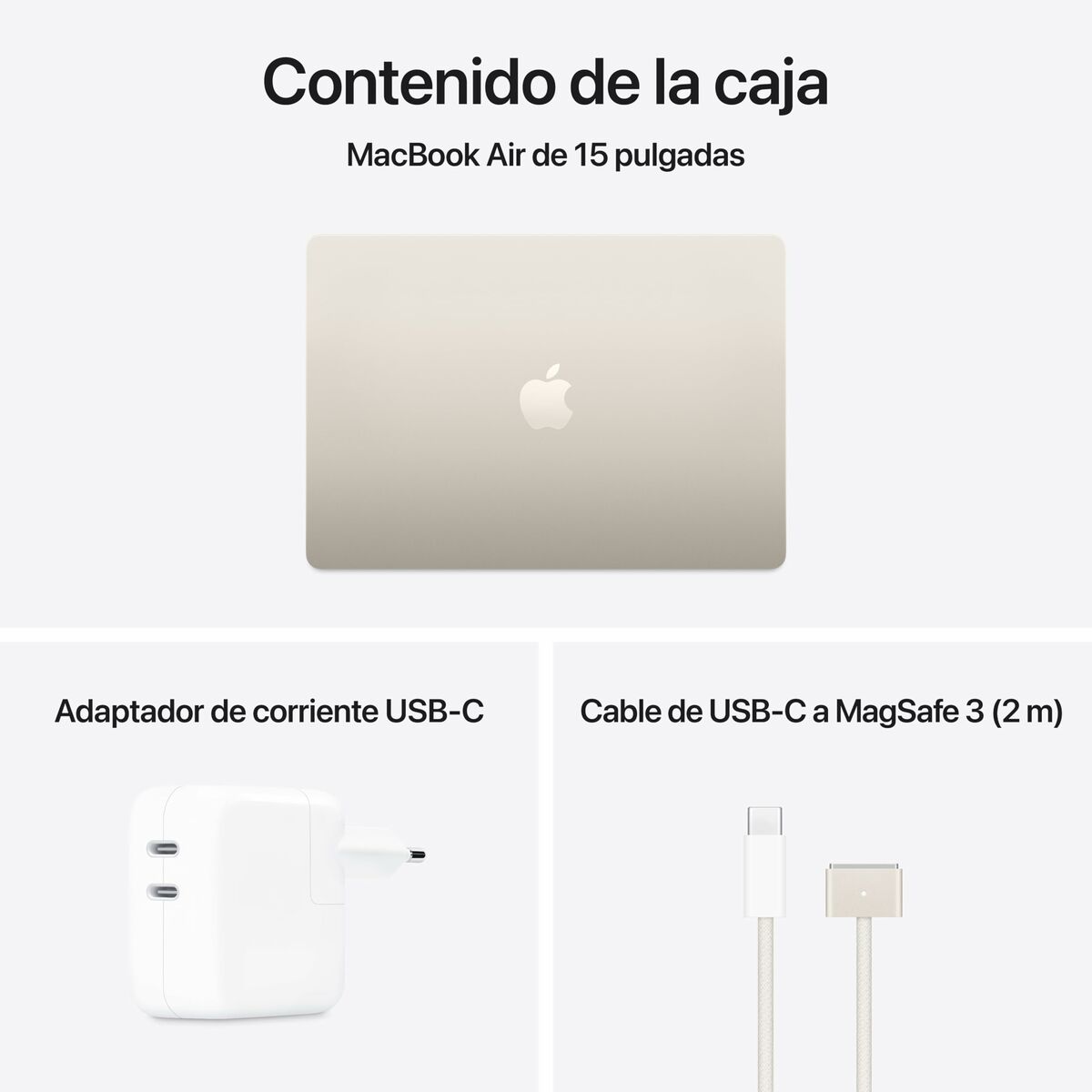 Apple-laptoppen udstyret med Apple M4-processoren tilhører Apple M-familien, kendt for høj effektivitet og optimeret ydeevne til professionelle og kreative opgaver. Denne bærbare computer har en generøs 24 GB RAM, som sikrer flydende multitasking og fremragende respons ved krævende programmer og redigerings- eller designsoftware. Dens 512 GB SSD-harddisk tilbyder hurtig og sikker lagring, hvilket forbedrer opstartstider og filindlæsning betydeligt sammenlignet med traditionelle diske. Enheden har en 15,3 tommer skærm med bred opløsning og præcis definition, der gør det muligt at arbejde detaljeret med grafik, billeder eller video, selvom den ikke har touch-funktion. Det ydre design fremhæves i beige, hvilket giver et sobert og elegant udseende. Denne model inkluderer et QWERTY-tastatur på spansk, der gør skriveoplevelsen nemmere for spansktalende brugere. Derudover har den Bluetooth-forbindelse og understøtter Wi-Fi 6E (802.11ax), hvilket sikrer hurtige og stabile trådløse forbindelser, ideelle til dataoverførsel og kommunikation med andre enheder. Blandt de ekstra funktioner findes macOS Sequoia forudinstalleret som operativsystem, som tilbyder et sikkert, intuitivt og effektivt miljø, samt en fingeraftrykslæser for øget sikkerhed og nem adgang. Grafikkraften leveres af en integreret Apple GPU, der supplerer hardwaren til avanceret visuel gengivelse uden behov for ekstern dedikeret grafikhardware. Modellen har ikke et optisk drev, hvilket passer til nutidens fokus på digital lagring og streaming. Samlet set positionerer denne Apple-laptop sig som en avanceret løsning til professionelle brugere, der kræver en balance mellem høj ydeevne, hurtig lagerplads og moderne tilslutningsmuligheder i en kompakt og stilfuld enhed.