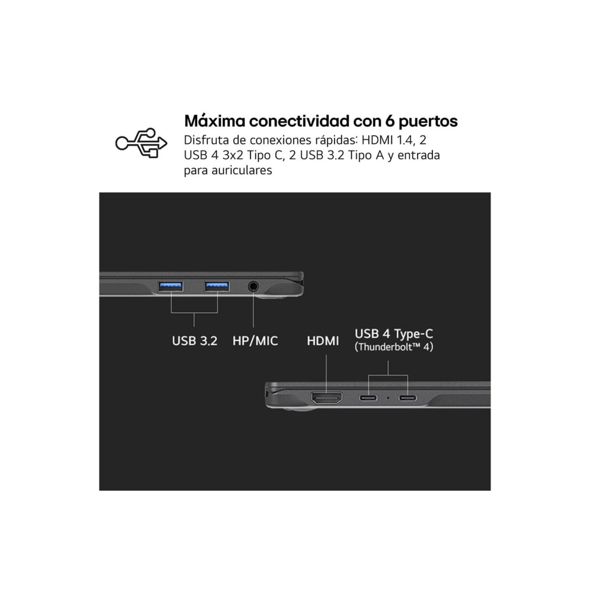 16Z90RU-G.AA55B fra LG er en laptop designet til brugere, der har brug for en balance mellem ydeevne og bærbarhed i en moderne og effektiv enhed. Denne model har en kraftfuld Intel® Core™ i5-1334U processor med 10 kerner (2 højtydende og 8 effektive), med hastigheder op til 4,6 GHz, hvilket sikrer hurtig respons ved multitasking og krævende programmer. Den har 16 GB LPDDR5x-6400 integreret RAM, der giver en flydende oplevelse i arbejds-, design- eller underholdningsmiljøer. Intern lagerplads er et 512 GB M.2 NVMe SSD, ideelt til hurtig opstart og programindlæsning samt rigelig plads til store filer og projekter. Den 16 tommer touchskærm med WQXGA (2560 x 1600) opløsning anvender IPS-teknologi med 400 nits lysstyrke, antirefleks- og fingeraftryksafvisende overflade, som leverer præcise farver (100 % sRGB) og høj skarphed til kreative opgaver eller avanceret visning. Grafikken håndteres af integreret Intel Graphics, egnet til multimedieopgaver og let redigering. Tilslutningsmuligheder inkluderer Bluetooth 5.1 og et komplet sæt porte: to USB 3.2 Type-A, to USB 4 Type-C med hurtig opladning, DisplayPort og Thunderbolt 4 samt HDMI 2.1, hvilket gør det nemt at tilslutte eksterne enheder, skærme og hurtige dataforbindelser. Tastaturet er QWERTY på spansk med et fuldt baggrundsbelyst numerisk tastatur, ideelt til effektiv skrivning i svagt lys. Den har HD-kamera og dobbelt indbygget mikrofon til kvalitetsvideoopkald. Batterilevetiden er cirka 23,5 timer, understøttet af en 65W USB-C adapter til hurtig og effektiv opladning. Sikkerhedsfunktioner omfatter HDD Security, fTPM/HW, mulighed for fingeraftrykslæser og sikker tilstand, der deaktiverer kamera og mikrofon, samt Kensington-lås til fysisk beskyttelse. Designet er kompakt med dimensioner på 355,9 x 243,4 x 16,8 mm og en vægt på 1.199 gram, hvilket fremmer mobilitet uden at gå på kompromis med ydeevnen. Operativsystemet er Windows 11 Plus, som giver den nyeste brugeroplevelse og kompatibilitet med moderne software. Denne LG bærbare kombinerer avanceret teknologi og funktionalitet for professionelle og studerende, der søger en pålidelig, alsidig enhed med topmoderne tekniske egenskaber.