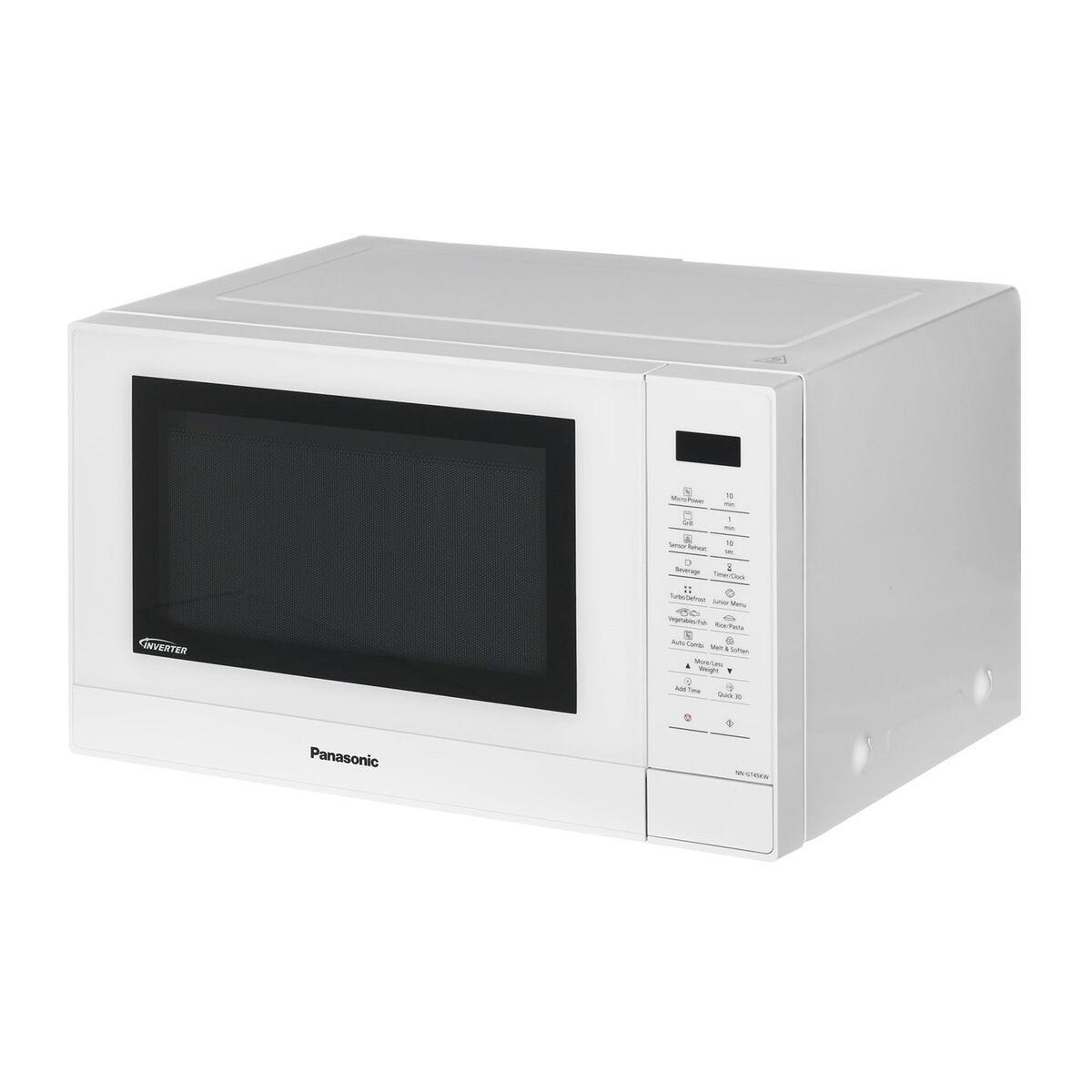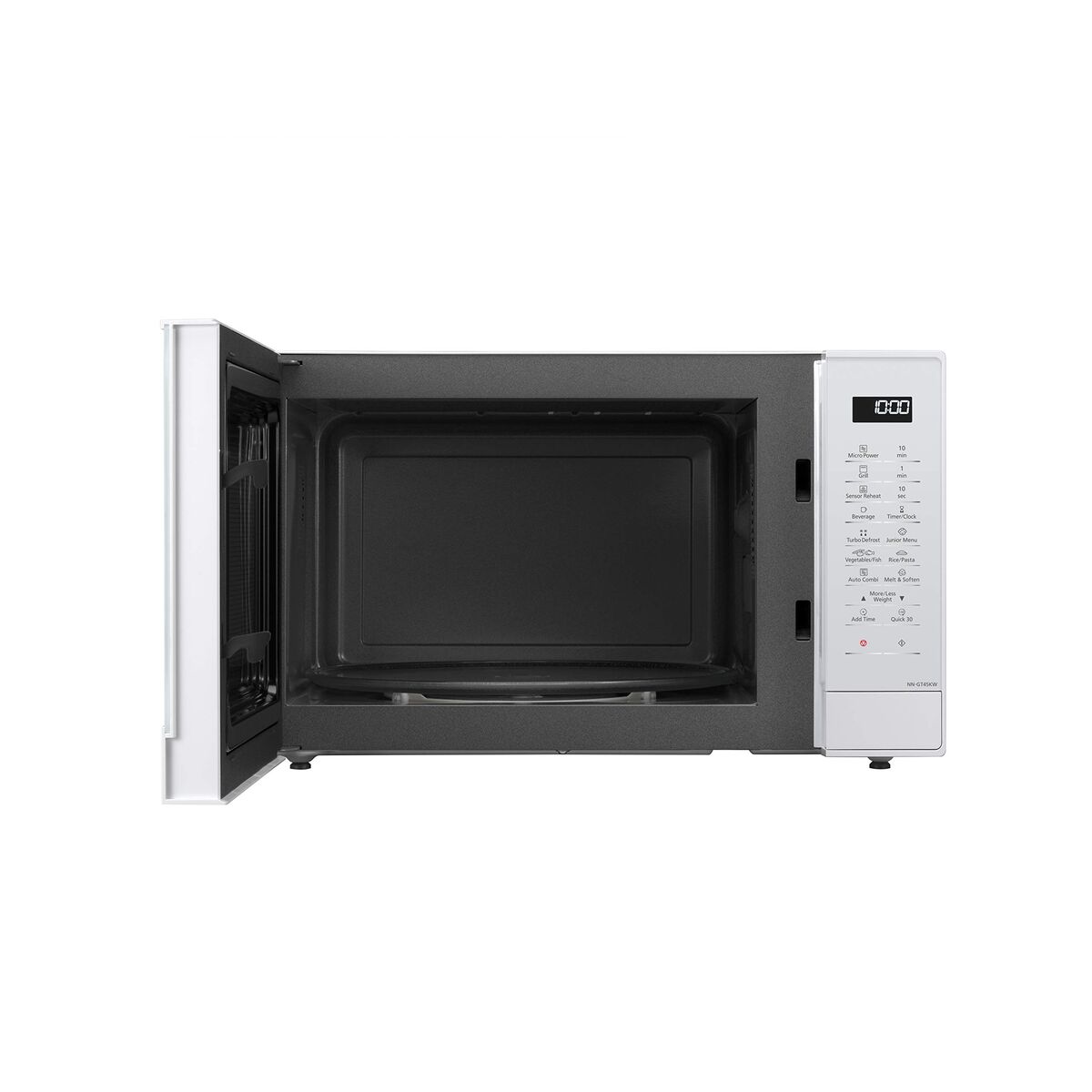 Panasonic NN-GT45KW. Indvendig kapacitet: 31 L, Mikrobølgeeffekt: 1000 W, Kontroltype: Knapper. Tilsluttet belastning: 1000 W, AC indgangsspænding: 230 V, AC frekvens: 50 Hz. Bredde: 525 mm, Dybde: 310 mm, Højde: 401 mm