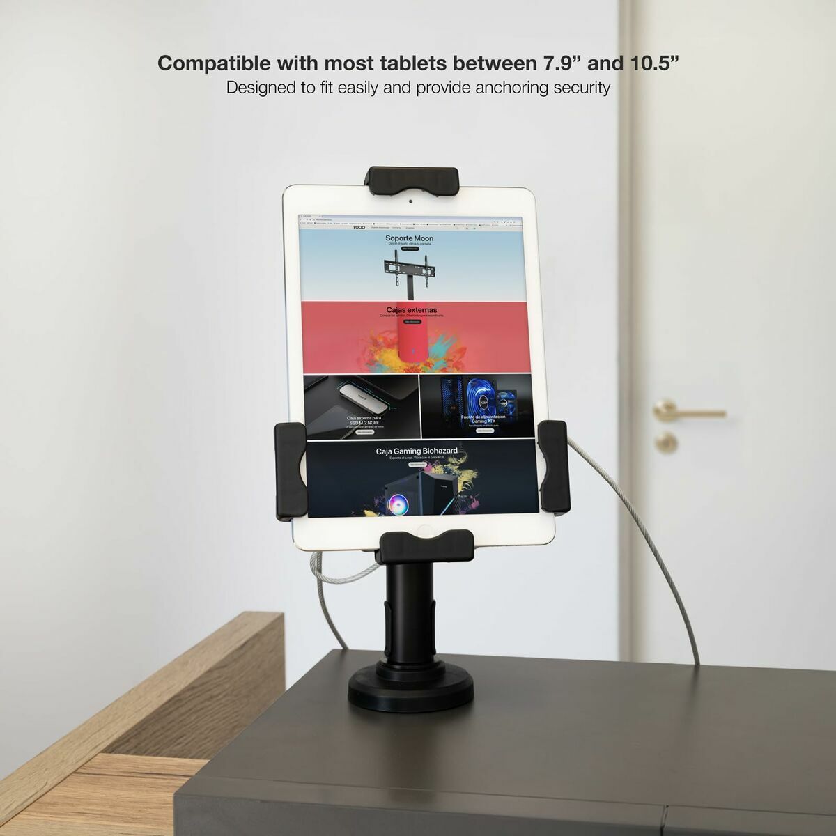 TooQ TQTDS0812 mobilholderen er en robust og alsidig løsning designet til butikker og offentlige rum, som giver sikker og funktionel fastgørelse til tablets mellem 7,9” og 10,5”. Fremstillet i højkvalitetsstål med sort finish, kombinerer denne holder styrke med et diskret og professionelt design, ideelt til krævende miljøer. Den har et avanceret rotations- og vippe-system, der tillader en hældningsvinkel på -70º til +70º, en drejning på -165º til +165º og en skærmrotation på -180º til +180º, hvilket gør det nemt at justere enhedens position for optimal visning fra alle vinkler. Basen kan fastgøres sikkert både til bord og væg med det medfølgende monteringssæt, som indeholder skruer og en speciel vægadaptor, hvilket giver fleksibel installation efter pladsforhold. Derudover har den et integreret kabelstyringssystem, der hjælper med at holde området ryddeligt og undgå sammenfiltring, samt et sikkerhedslås til beskyttelse mod tyveri i offentlige miljøer. Holderens justerbare dimensioner tillader fastgørelse af tablets med en bredde mellem 134 mm og 197 mm og en højde på holderen mellem 196 mm og 270 mm, med en samlet højde på 215 mm fra base til holderens centrum, hvilket sikrer universel tilpasning til forskellige størrelser og modeller. Med en vægt på ca. 0,99 kg kombinerer denne holder stabilitet uden at være klodset. Pakken indeholder holderen, vægadaptor, monteringssæt (uden værktøj) og en installationsvejledning, hvilket gør opsætningen enkel. Samlet set tilbyder TooQ TQTDS0812 mobilholder en afbalanceret kombination af funktionalitet, sikkerhed og tilpasning til visning og brug af tablets i professionelle miljøer med holdbarhed og brugervenlighed i enhver installation.