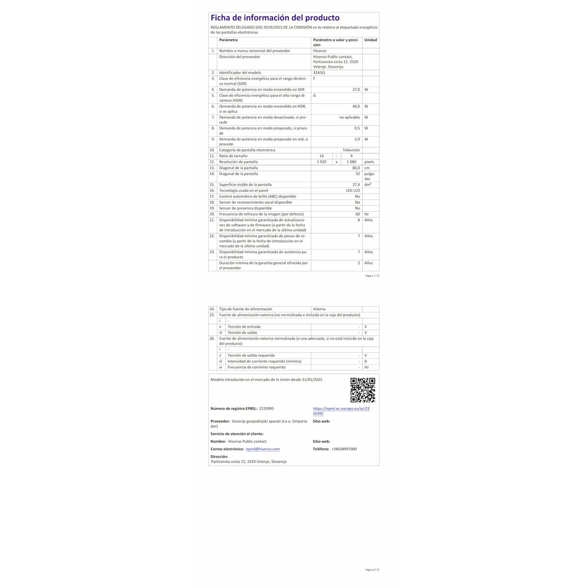 Hisense 32A5Q er et Smart TV på 32″ designet til at levere en afbalanceret visuel og lydmæssig oplevelse i små eller mellemstore rum. Udstyret med en 32-tommer QLED-skærm med Full HD 1920 x 1080 opløsning, giver det skarpe billeder og intense farver takket være avanceret panelteknologi, der forbedrer lysstyrke og farvemætning – ideelt til multimedieindhold og HD-udsendelser. Dette TV har et integreret lydsystem med en anslået effekt på 16W RMS, som sikrer klar lyd, suppleret med støjreduktion og equalizer-teknologi for bedre lydkvalitet til forskellige typer indhold. Derudover har det Wi-Fi forbindelse for adgang til Smart TV-apps og tjenester via operativsystemet VIDAA, som tilbyder en intuitiv og hurtig brugerflade til streaming og navigation. Det skiller sig også ud ved sin alsidighed i signalmodtagelse og understøtter både digitale og analoge tunere, inklusive de nyeste standarder som DVB-C, DVB-S, DVB-S2, DVB-T og DVB-T2, hvilket gør det nemt at få adgang til et bredt udvalg af kanaler og indhold i forskellige formater. Med sit sorte design og flade skærm i 16:9 format passer det let ind i ethvert rum, mens tilstedeværelsen af USB 2.0-porte gør det muligt at tilslutte eksterne enheder til medieafspilning eller opdateringer. Samlet set kombinerer denne model funktioner, der er velegnede til hjemmeunderholdning med billed- og lydkvalitet, der matcher forventningerne hos brugere, der søger et økonomisk og komplet smart TV til både traditionelt TV og digitale platforme. Hisense 32A5Q er et praktisk og funktionelt valg inden for 32-tommer TV med fokus på alsidighed og tilslutningsmuligheder.