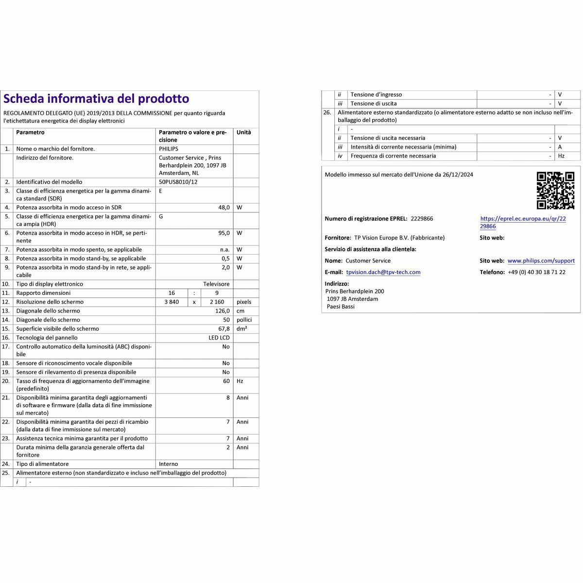 Smart TV Philips 50PUS8010 er et smart-tv designet til at levere en avanceret visuel og lydmæssig oplevelse i en størrelse, der passer til mellemstore og store rum, med en 50-tommer flad skærm og en native opløsning på 4K Ultra HD 3840 x 2160 pixels, som giver detaljerede, skarpe og veldefinerede billeder – ideelt til at nyde indhold i høj kvalitet fra digitale platforme. Dets styresystem Titan OS sikrer en flydende og intuitiv navigation i apps og streamingtjenester, hvilket gør det nemt at få adgang til et bredt udvalg af internetforbundet indhold via den indbyggede WiFi-forbindelse. Modellen har desuden en lydstyrke på 20W RMS, som leverer klar lyd med tilstrækkelig volumen til et standardrum og forbedrer multimedieoplevelsen uden behov for eksterne højttalere. Tv’et understøtter flere digitale signalformater, herunder DVB-C, DVB-S, DVB-S2, DVB-T, DVB-T2 og DVB-T2 HD, hvilket sikrer bred kompatibilitet med forskellige typer digitale udsendelser, både terrestriske, kabel- og satellitbaserede. Designmæssigt har det en sort finish, der giver et diskret og stilrent udtryk, som nemt passer ind i forskellige hjemmemiljøer. Modellen er også energieffektiv med en klassificering i kategori E, hvilket betyder et balanceret strømforbrug i forhold til størrelse og tekniske egenskaber, og leveres med inkluderede tilbehør til hurtig installation og brug. Derudover har den en ECO-funktion, der hjælper med at optimere energiforbruget baseret på brug og omgivelser. Alt i alt er Philips 50PUS8010 et alsidigt og komplet valg for brugere, der søger et stort smart-tv med opdateret tilslutning, højopløseligt billede og en energivenlig opsætning, velegnet til en tilfredsstillende og funktionel hjemmeunderholdningsoplevelse.