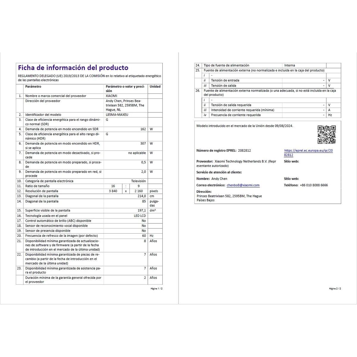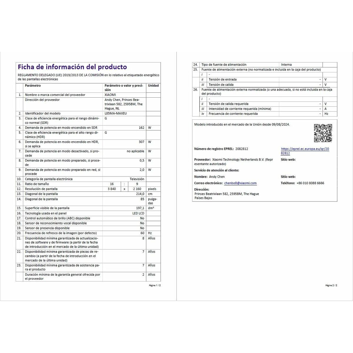 Smart TV 85″ Xiaomi model ELA5730EU tilbyder en imponerende visuel oplevelse takket være sin 85-tommer QLED-skærm med en 4K Ultra HD-opløsning på 3840 x 2160 pixels, der sikrer skarpe billeder, levende farver og høj detaljegrad selv i stort format. Dette TV har et elegant design i grå farve med metal-materialer, der giver robusthed og en moderne stil, som passer godt ind i rummelige stuer. Det har desuden et standard 16:9 billedformat for korrekt visning af panoramisk indhold. Med hensyn til tilslutning har det Bluetooth til trådløs forbindelse med eksterne enheder samt flere USB 2.0-porte, der gør det nemt at afspille multimedieindhold direkte. Det installerede styresystem er det anerkendte Google TV, som giver adgang til et bredt udvalg af apps og streamingtjenester med en intuitiv brugerflade og regelmæssige opdateringer. På signalfronten har modellen en multitaler digital tuner kompatibel med DVB-C, DVB-S2 og DVB-T2, hvilket sikrer fleksibilitet til at modtage kabel-, satellit- og digitalt terrestrisk TV uden ekstra udstyr. AMD FreeSync-teknologien reducerer billedrevner og forbedrer flydende bevægelse, ideelt til spil og sport. Den har indbygget Wi-Fi og understøtter Miracast, så du nemt kan dele skærm og indhold trådløst fra mobile enheder. På lydsiden leverer den en estimeret effekt på 30W RMS, som er tilstrækkelig til mellemstore rum uden behov for ekstern forstærker. Med energimærkning G er dette en model for dem, der ønsker et stort TV med avanceret teknologi, intelligente funktioner og solid tilslutning i et enkelt og moderne design. Kort sagt er Xiaomi ELA5730EU et alsidigt valg, der kombinerer høj billedkvalitet med mange tilslutningsmuligheder, velegnet til brugere, der ønsker et stort TV med fuld funktionalitet til digital underholdning.