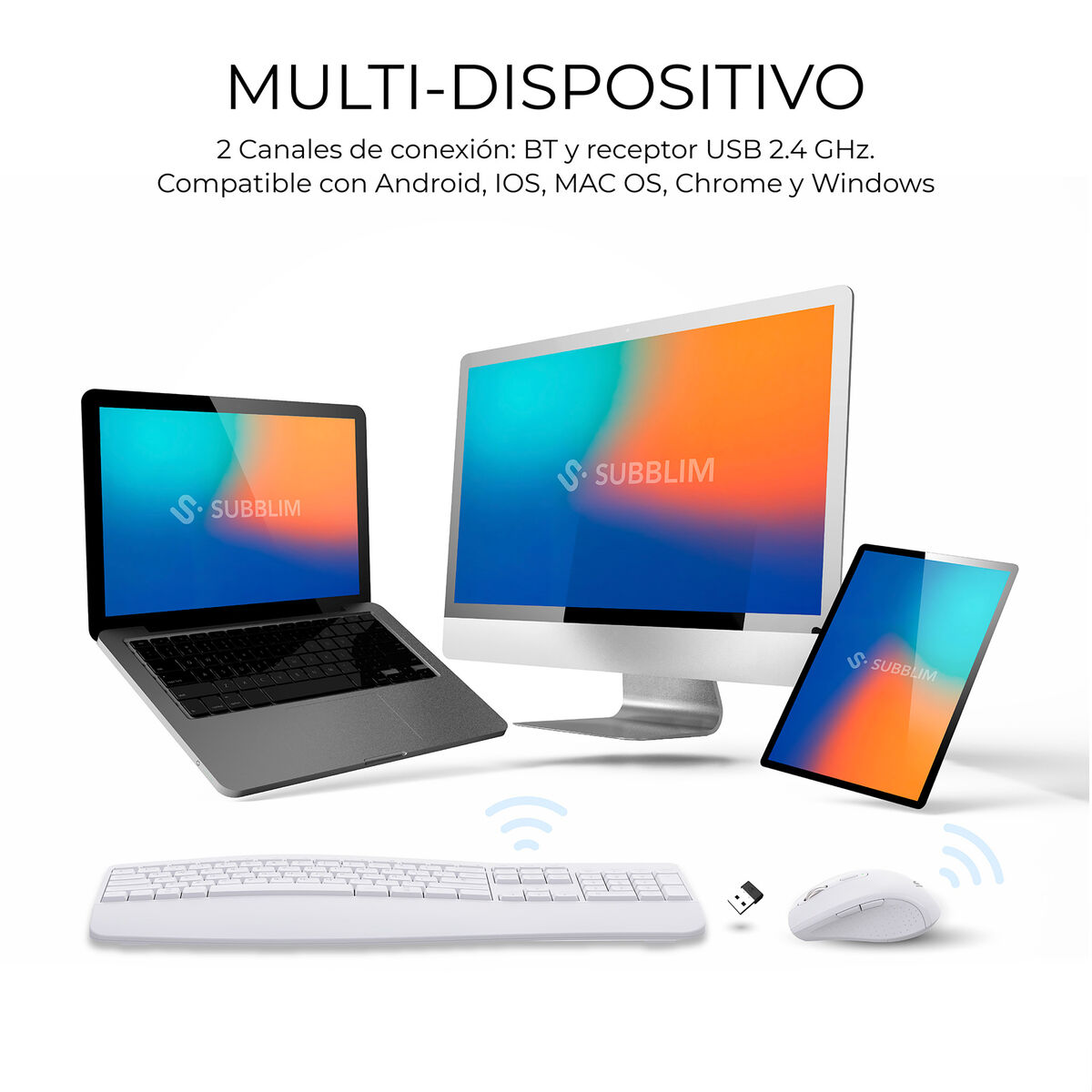 OFFICE PROWAVE-kombinationen fra Subblim er et avanceret sæt designet til at tilbyde en komfortabel og effektiv brugeroplevelse i kontor- eller hjemmearbejdsområder. Den integrerer et trådløst Bluetooth-tastatur og -mus for større frihed og bedre organisering af arbejdspladsen. Tastaturet er et spansk QWERTY-layout med komplet design, inklusive et numerisk tastatur, ideelt til opgaver med hurtig indtastning af tal og omfattende brug af kontorprogrammer. Den hvide finish giver et moderne og rent udseende, der passer til både professionelle og private miljøer. Den medfølgende mus har høj præcision med justerbar følsomhed op til 3200 DPI, hvilket sikrer flydende bevægelse og præcis kontrol, velegnet til både detaljeret arbejde og hurtig navigation. Bluetooth-forbindelsen sikrer kompatibilitet med mange enheder uden ekstra kabler, hvilket letter mobilitet og pladsorganisering. Denne kombination er en praktisk og funktionel løsning, der fokuserer på ergonomi, præcision og brugervenlighed uden at gå på kompromis med stil og moderne design. Kort sagt tilbyder SUBBLIM Combo Dual OFFICE PROWAVE WHITE en balanceret kombination af ydeevne og design for brugere, der søger pålideligt og alsidigt udstyr til daglige opgaver.