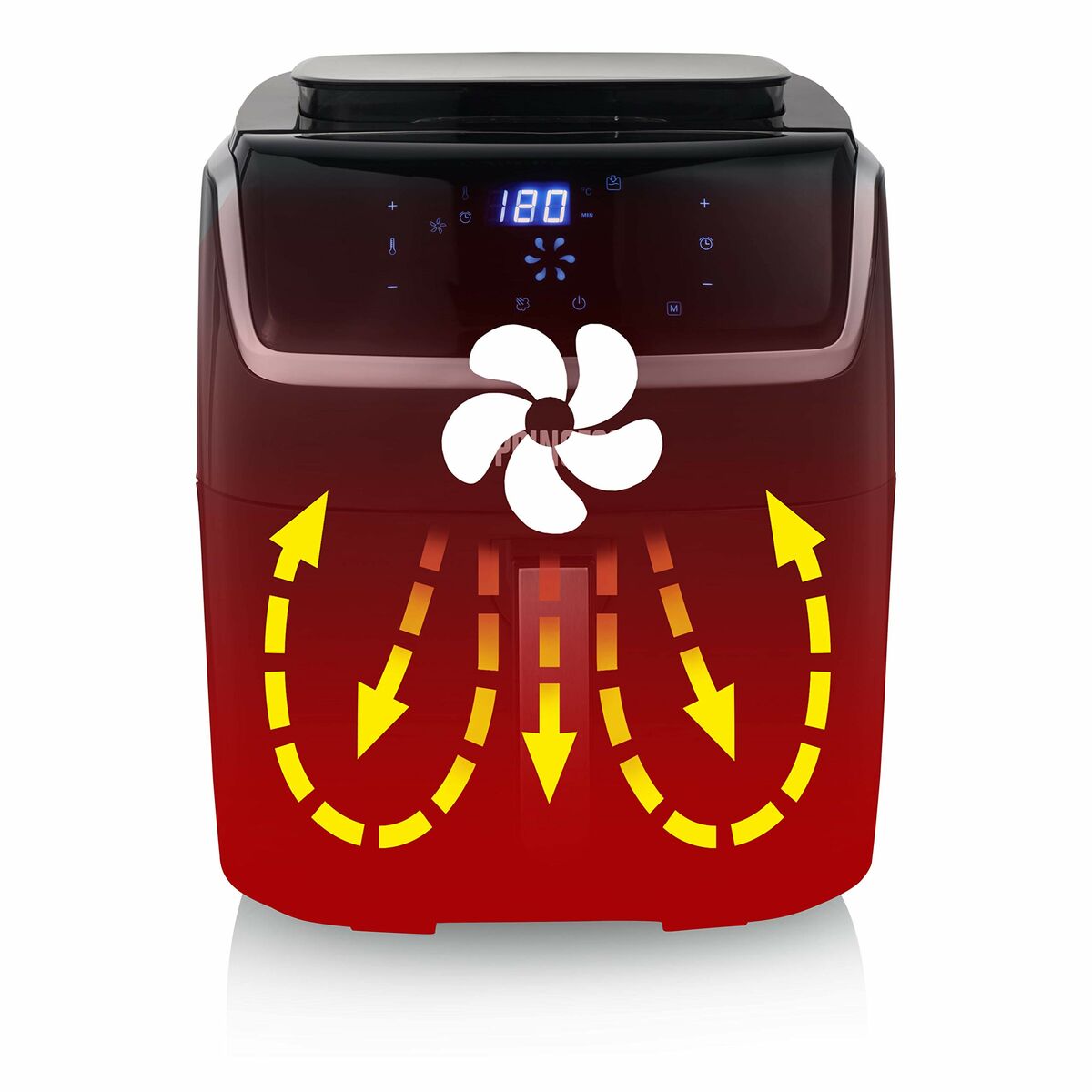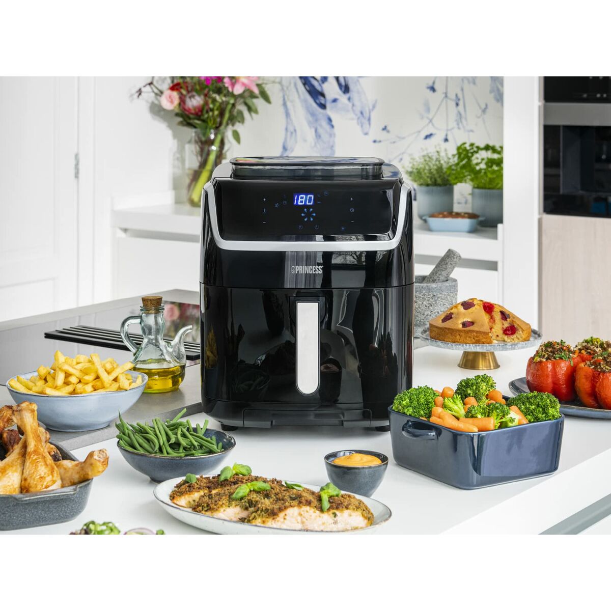 Princess model 182080 airfryer er et alsidigt apparat, der kombinerer praktiskheden ved en airfryer med dampfunktionen, hvilket gør det muligt at tilberede mad sundere og hurtigere. Med en effekt på 1700 W sikrer denne airfryer effektiv og jævn opvarmning for optimale resultater ved hver tilberedning. Dens kapacitet på 6,5 liter er ideel til familier og giver plads til at tilberede store mængder mad på én gang, fra grøntsager og kød til komplette retter. Det sort farvede design og holdbare materialer som ABS-plast sikrer lang levetid og nem rengøring samt et moderne udseende, der passer ind i ethvert køkken. Den har en automatisk slukning, som øger sikkerheden under brug ved at forhindre overophedning og gøre det nemt at styre tilberedningstiden. Strømforsyningen sker via et europæisk stik (EU-stik), kompatibelt med de fleste hjem i Spanien og Europa. Denne multifunktionelle enhed kan, udover at friturestege hurtigt med varm luft uden store mængder olie, også dampe mad, hvilket udvider madlavningsmulighederne og understøtter en mere balanceret kost. Samlet set tilbyder Princess 182080 airfryeren en balance mellem funktionalitet og brugervenlighed og er en effektiv løsning for dem, der ønsker at optimere den daglige madlavning med et robust og let håndterbart apparat.